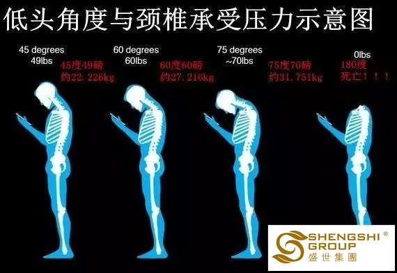 歐洲脊柱協會聲明中稱,一個人的頭部重約5kg,當前傾看手機等電子設備時,通常呈60°角,那么這時由于物理杠桿作用以及重力作用,一個人頸部肌肉就要承受25kg以上的重量。長時間保持這一姿勢,會出現頸部不舒服、疼痛、僵硬以及頭痛等癥狀長期以往,這些癥狀則會加重,造成頸椎病等遠期損害。