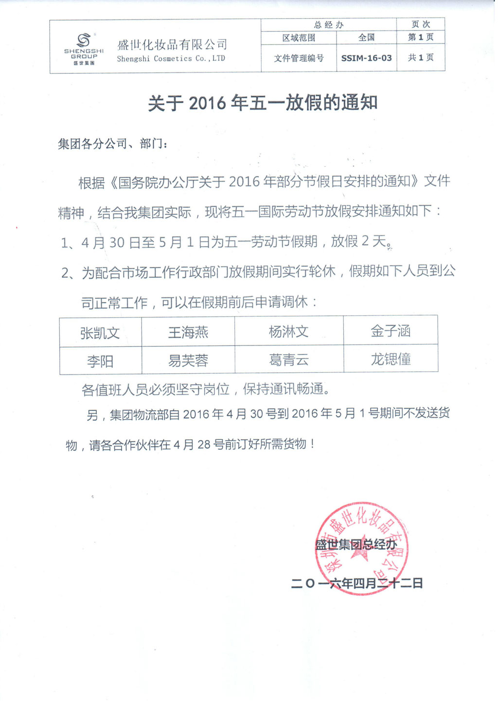 關于2016年五一放假的通知 2016-04-22