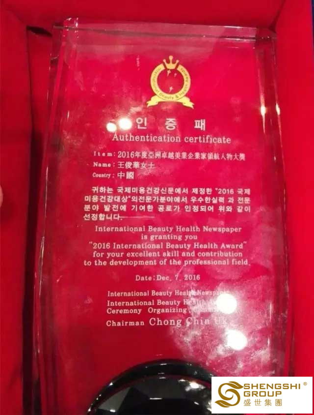 【2016年12月7日】盛世集團董事長王俊華女士榮獲“2016年度亞洲卓越美業企業家領航人物大獎”